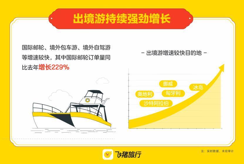 今年春节假期出境游在去年高基数基础上继续强劲增长。飞猪数据显示,国际邮轮、国际租车、境外一日游等增速靠前,其中国际邮轮订单量同比去年增长229%。中国港澳、东亚、东南亚依然是最热门的出境游目的地,同时美国、澳大利亚、法国也跻身海外游目的地前十名,匈牙利、挪威、沙特阿拉伯、冰岛、奥地利等国家增速较快,订单量较去年普遍翻倍。