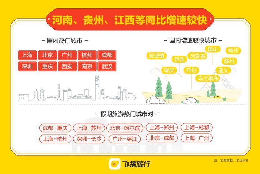 从目的地来看,广东、上海、浙江、北京、四川等省(直辖市)在出游规模上领先,河南、贵州、江西、黑龙江、山西等省份同比增速较快。具体到城市而言,上海、北京、广州、杭州、成都、深圳、重庆、西安、南京、武汉等是最热门城市,景德镇、肇庆、伊犁、阿勒泰、开封、黄山、乌兰察布、梅州、赣州、遵义等城市增速最快。成都-重庆、上海-苏州、深圳-长沙、上海-郑州、广州-湛江等是春节假期游客双向流动的热门城市对。